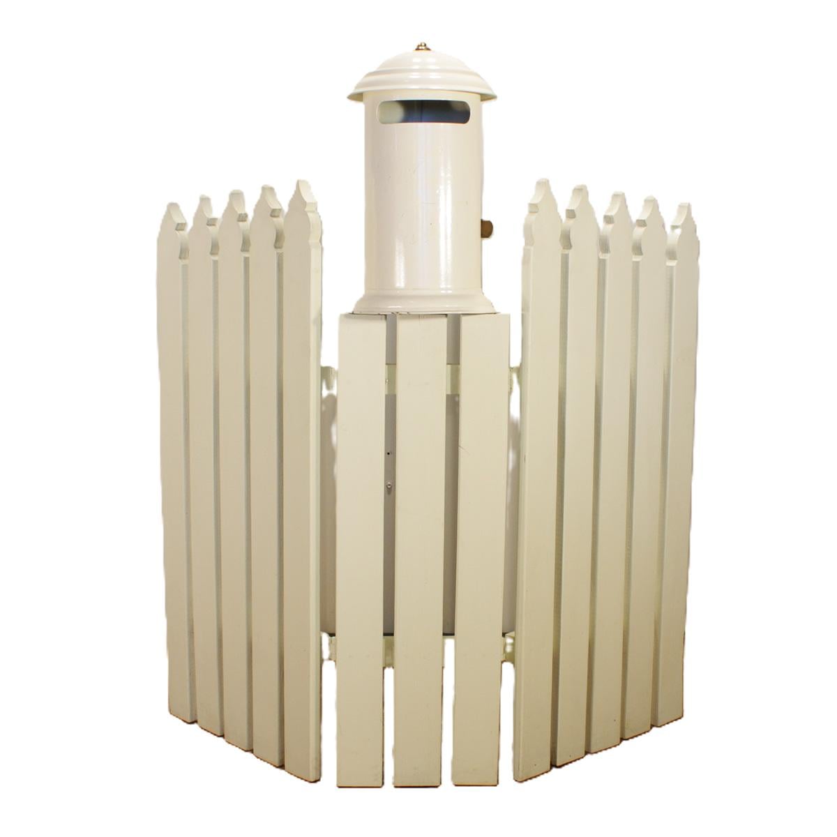 A quaint metal collection box mounted onto a picket fence.